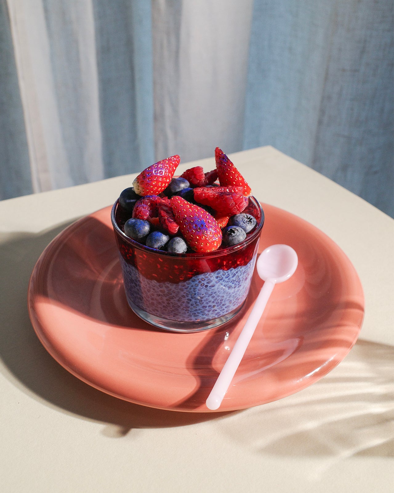 3. Add the fresh berries, finish the pudding with a dust of blue spirulina powder and enjoy