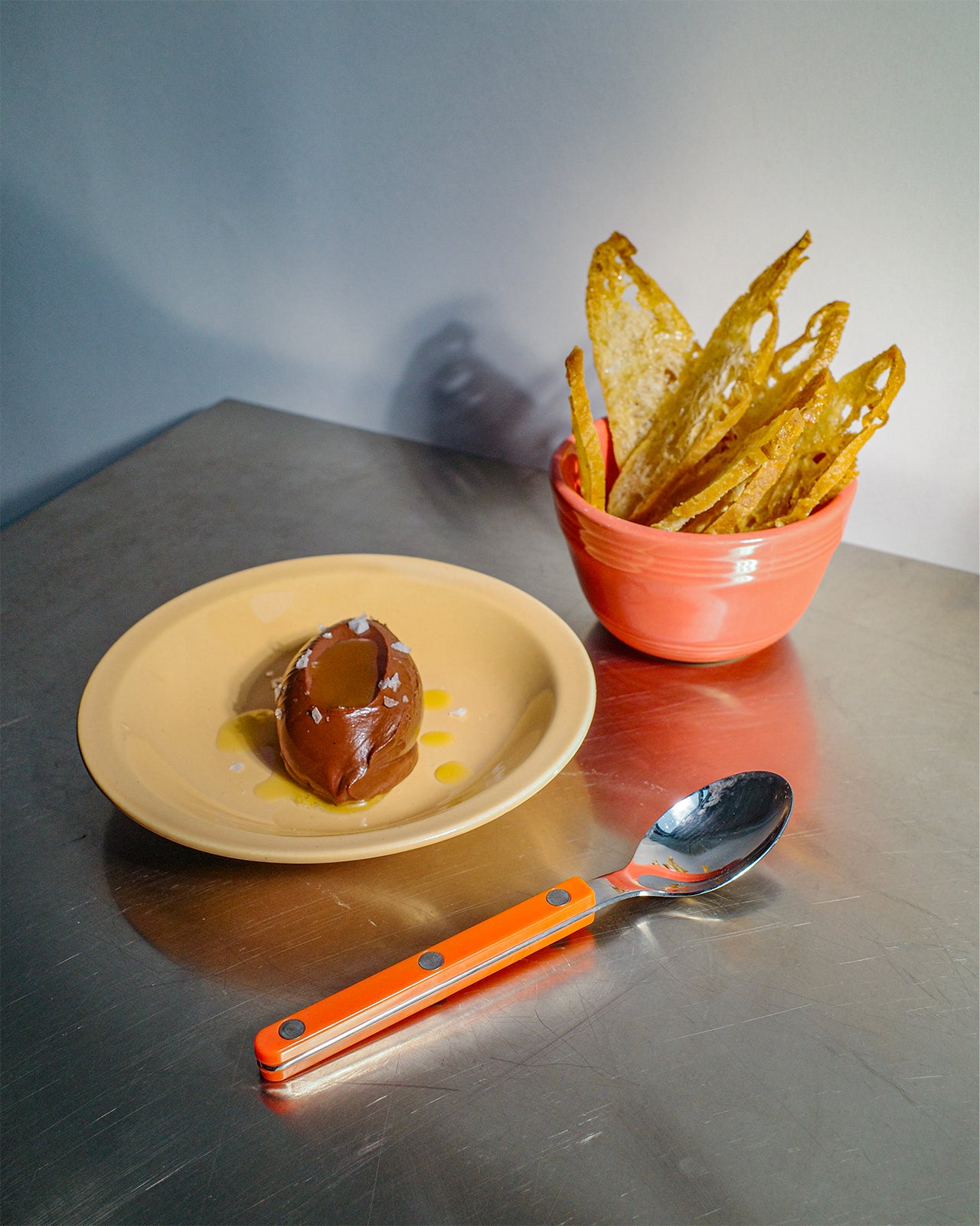 A velvety blend of dark chocolate and Koatji milk, sweetened with date syrup and vanilla, finished with a touch of sea salt and extra virgin olive oil. Paired with crispy breadsticks, this luxurious dessert offers the perfect balance of sweet and savory in every bite.
